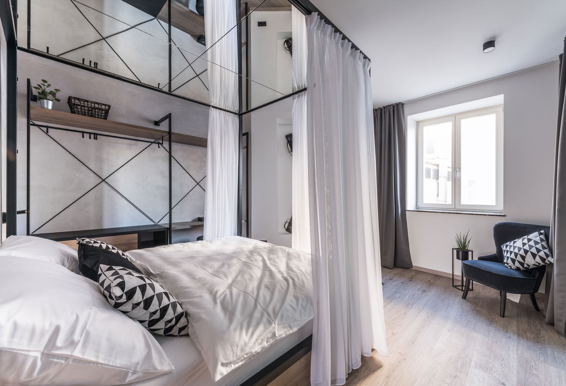 Vězeňské apartmá bylo inspirováno brněnskými Kasematy – vězení, jež bylo součástí pevnosti hradu Špilberk. V pokoji zažijete pravou vězeňskou atmosféru. Dominantou je minimalistický nábytek a monochromatické doplňky, nechybí zde betonové stěny, vězeňská postel, či pouta a další mučicí nástroje. Tento pokoj je pro všechny, kteří chtějí zažít něco nového.