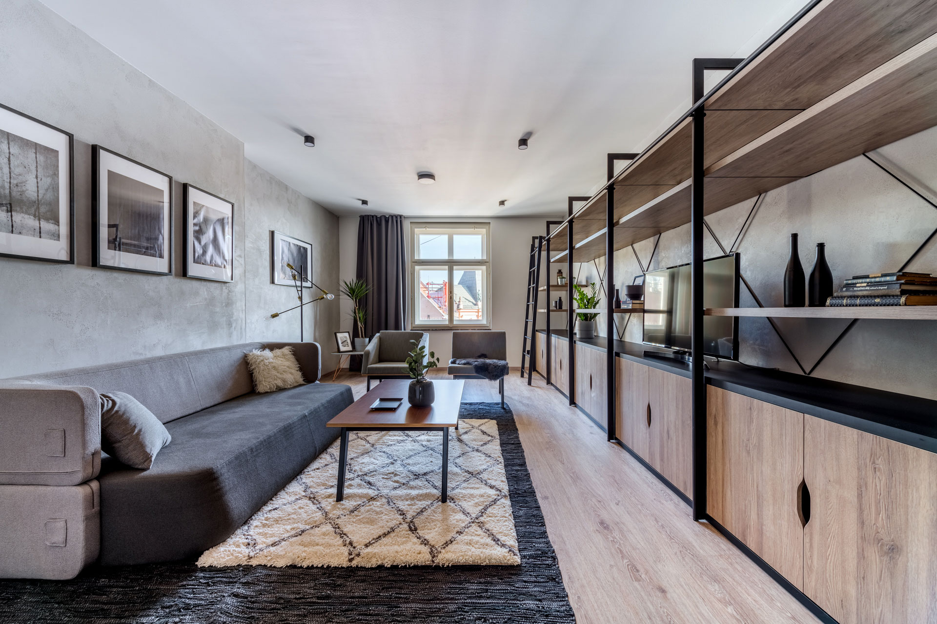 obývací pokoj, ložnice s manželskou postelí, pracovní stůl, vlastní koupelna s toaletou